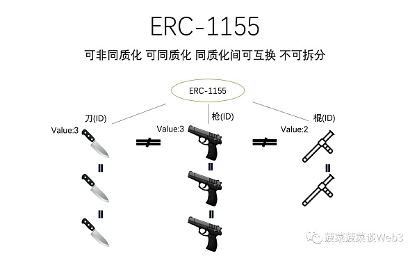 ERC-1155 提供了一種在單一智能合約中管理多種代幣的方法,每種代幣可以是同質的(像 ERC-20 代幣)或是非同質的(像 ERC-721 代幣),比如在游戲中,你可以用 ERC-1155 創建不同的武器種類(非同質化)如棍子、刀、槍,而在每個武器種類(非同質化)下的每一個武器都是同質化的,1 號刀和 10 號刀都是完全一樣的(同質化),但刀和槍是不一樣的(非同質化)。