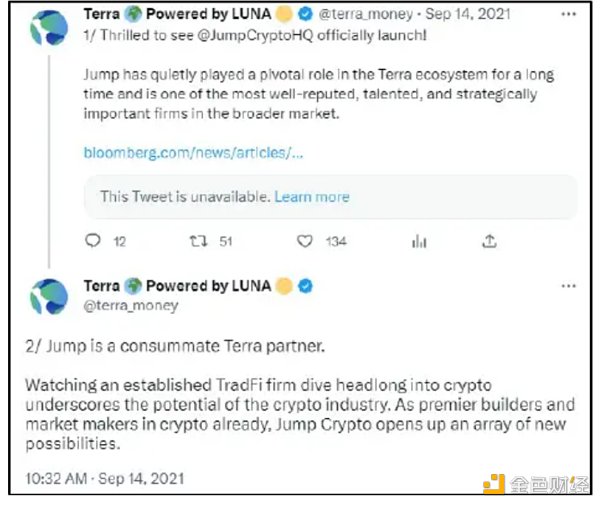 2021年9月,在正式宣布Jump Crypto成為Jump的加密貨幣部門后,TFL在推特上表示祝賀,稱Jump是“Terra完美的合作伙伴,一直以來在Terra生態系統中默默發揮著關鍵作用”。
