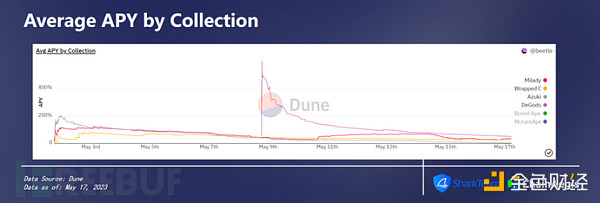 年利率(Annual Percentage Yield,APY)指的是一年復利(利息+本金)所賺取的金額。據Dune數據統計,DeGods,MutantApeYachtClub和Bored Ape Yacht Club系列上線第一日APY分別高達479%、230%、260%。上線后開始迅速降低,截止到5月17日,MutantApeYachtClub、DeGods、Azuki、Milady、Bored Ape Yacht Club、Wrapped Cryptopunks的APY分別為39%,19%,7%,30%,8%,58%。