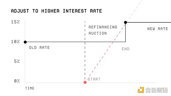 到期時,如果借款人沒有償還債務,再融資拍賣將從 0% 開始,利率穩步上升。一旦拍賣達到新貸方有興趣放貸的利率,新貸方可以通過在鏈上提交報價來接受它。新貸方向舊貸方支付全部還款額,從拍賣完成的那一刻開始計算,并接管貸款直到新的到期時間(可以計算為當前到期時間加上一些協議指定的貸款期限) ,使用拍賣達成的利率。
