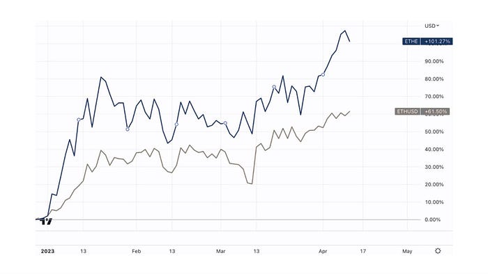 2022年底以來的牛市反彈,ETHE最高107%,遠大于ETH的61%,可見在折價周期中已經計入了相當多悲觀因素,所以當市場反彈時,ETHE的彈性大于ETH,是對牛市更好的押注。