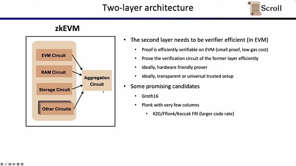 因為在L1上直接驗證上述的EVM電路,內存電路,存儲電路等,開銷巨大,Scroll 的證明系統采用了兩層架構。