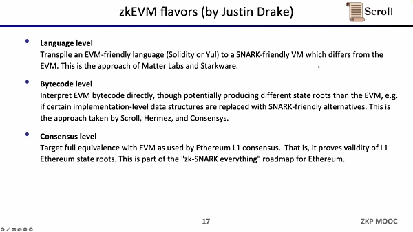 第二類是 Scroll 在做的字節碼層面的兼容,是直接證明EVM的字節碼處理正確與否,直接繼承了以太坊的執行環境。在這里可做的一些取舍是,使用和EVM不一樣的狀態根,例如使用ZK友好的數據結構。Hermez 和 Consensys 也在做類似的事情。