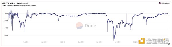 市場中也有觀點認為,體量大的質押者會由于擔心衍生品的流動性不足,出售可能發生折價,因此其會等待上海升級完退出質押后再賣出。這種顧慮不無道理,但是我們回顧以太坊歷史價格,如下圖所示,可以看出在 2021 年 3 月和 2022 年 6 月期間出現過大幅折價,在 2021 年 3 月時,是因為當時正處在大盤高點,這部分賣出的多為 2020 年底質押的用戶,在此套現離場;2022 年 6 月的這次折價,則是因為當時 3AC 和 FTX 事件,使得部分機構大量出售 stETH 導致價格脫錨,由此可以看出,對于大資金體量的投資者,在流動性不足的情況下依然會有拋售行為,這取決于市場情況,而非對于流動性的顧慮,因此將以太坊未來下跌的可能性完全歸因于對于流動性緊縮的預期是不正確的。