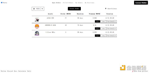 Putty 是構建在 Ethereum 上點對點的 NFT(ERC 721)和 Token(ETH 或 ERC 20)期權市場,用戶可以為單一資產(某一個 NFT 系列的地板價或某一個 NFT 系列中的某個單品)或一籃子資產的看跌和看漲期權創建買入或賣出限價指令。用戶的頭寸本身即是一種 NFT:OPUT,因此它可以被用于在用戶錢包間的轉移。用戶可以使用 WETH、DAI、wsETH 三種資產創建期權限價訂單。目前支持的 NFT 除了諸如 BAYC、MAYC、Azuki 等藍籌 NFT 外,還包括 Art Gobblers、The Saudis、Otherdeed、ENS 等共 18 種;Token 則包括 UNI、SHIB、WBTC、WETH、DAI 和套娃 NFTX 協議的 NFT 流動性 Token。Dune Analytics 數據顯示,Putty 共完成了 22.1 萬美元的期權交易量,目前市場上有 Azuki 89、SHIB 和 MILS 的期權限價訂單。
