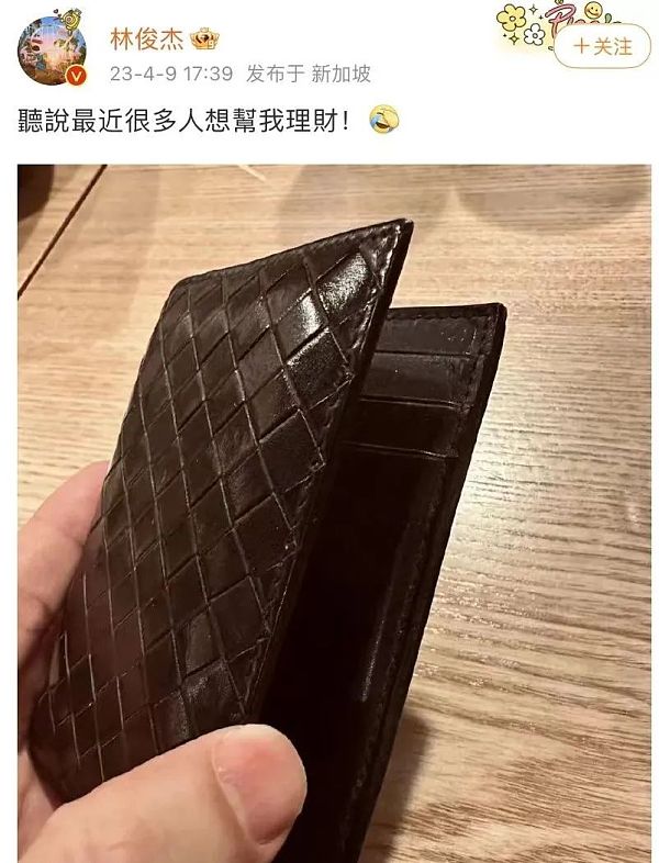 4月9日,林俊杰在個人微博發文,“聽說最近很多人想幫我理財”,并配以一張“錢包”的圖片,疑似是在回應這次風波。