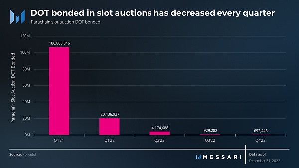 平行鏈插槽的第一場拍賣于 2021 年第四季度開始。正如預期的那樣,最初的拍賣吸引了大量參與者。由于對牛市的高度期望,它們導致大量 DOT 被綁定。自首次拍賣以來,DOT 保稅量每個季度都在減少。