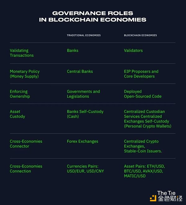 區塊鏈經濟體可以被視為具有不同治理結構的不同經濟體。確定小型項目的領導者很簡單,但確定誰管理以太坊和比特幣等大型去中心化平臺可能具有挑戰性。在鏈上治理的背景下,特別是對于由 DAO 代幣及其相關投票權治理的系統,這個過程可以比作捐助者每年為游說政客而進行的財政捐款。捐贈者不會在他們喜歡的候選人當選時直接獲得任何好處,但其企業可能會從未來的經濟政策變化中受益。
