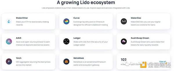 Lido Finance 借助其先發優勢,與眾多 DeFI 項目進行合作,建立了 stETH 的豐富生態。目前在各大主流 DeFi 協議都能看到 stETH 作為對象的金融服務,大量的被接受的 stETH 必然會是大部分質押用戶的首選,因為這意味著更為靈活的策略。
