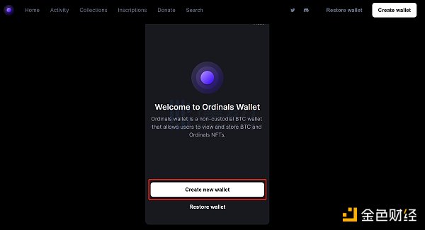 Ordinals Wallet 是沒有瀏覽器插件的,屬于「網站內置錢包」。進入官網后,點擊「Create Wallet」: