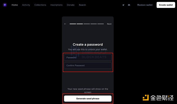 「Password」框內輸入新密碼,「Confirm Password」框內再次輸入設定的新密碼確認,然后點擊「Generate seed pharse」:
