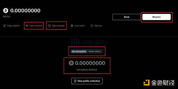 - 「Receive」:點擊「Receive」將得到充值地址。要想在 Ordinals Wallet 中購買比特幣 NFT,需要往充值地址內轉入比特幣。如果是使用 CEX 直接提幣,選擇 Bitcoin 網絡即可。