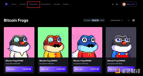 完成比特幣充值后,我們就可以開始購買比特幣 NFT 了。這里我們以 Bitcoin Frog 為例,在「Collections」中找到 Bitcoin Frog,在心儀的圖片下面點擊「Buy Now」:
