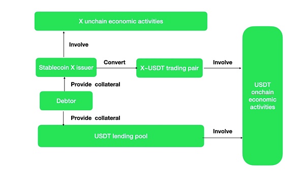 而如果擁有X穩定幣獨特的經濟活動,那么X相較于USDT,USDC就有了差異。這就會產生USDC,USDT換X,參與經濟活動的動力。