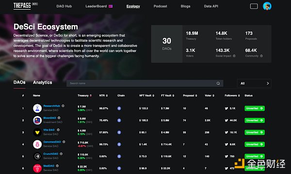 以上 DAO 為部分節選,如想了解更多請進入 ThePASS DeSci 生態圈子查看(https://www.thepass.to/ecology)。