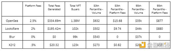 大多數用戶產生的費用或交易數都很少。值得注意的是,真正造成 Blur 和 OpenSea 間差異的是前 1% 的交易員,他們是 NFT 市場的關鍵驅動力。Blur 通過最近的空投和零費用吸引了頂級交易員。OpenSea 還實施了零費用以應對 Blur 的威脅。不過,目前尚不清楚這些平臺將如何在現階段產生收入。向收入很少的用戶空投代幣似乎不是一種合乎邏輯的營銷策略。為了證明這一點,下面的分析詳細說明了 LooksRare 和 X2Y2 如何向最終從未為其平臺產生任何收入的用戶空投大量代幣。