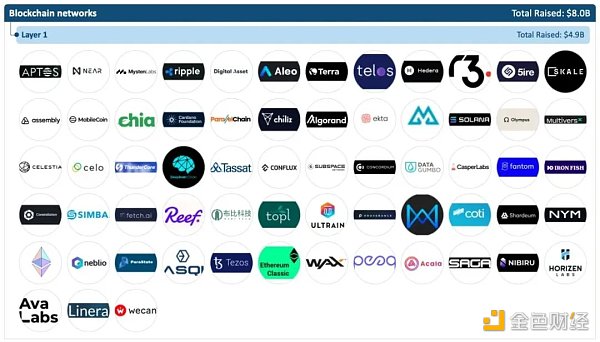在BTC和ETH兩個鏈之外,Layer 1共計有APTOS、NEAR等63個頭部項目,融資共計490億美元。