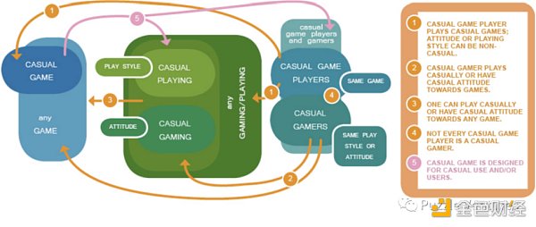 如圖 1 所示,學術界也曾經對「休閑游戲」的定義進行討論,認為休閑游戲不僅僅是從游戲本身的設計模式上屬于簡單玩法,也要從游戲玩家在玩游戲的態度上來定義。也就是說,當玩休閑游戲的玩家不是抱著休閑態度的游玩,而是抱著打金、沖榜等激進的態度游玩,那實際上他們的游玩行為已經不再是「休閑」狀態了。換句話說,當一個休閑游戲的 play to earn 元素過重,或者排行榜機制給的獎勵過高,會帶來游戲性質的改變。