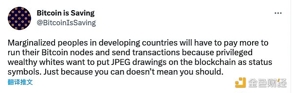 擁有近 30 萬粉絲的比特幣社區 KOL「Bitcoin is Saving」認為,NFT 頭像是一種特權身份象征,只有那些富裕的投資者才有機會獲得,如果網絡費用大幅增加勢必會把更多邊緣人群排除在比特幣網絡之外,不利于推動加密采用。