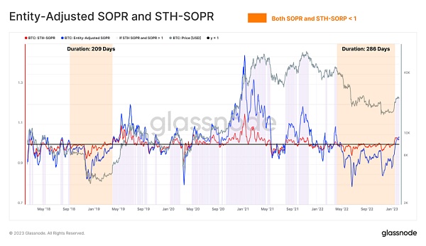 可以看出,目前短期持有者SOPR(紅色)在 1.0 以上的值持續交易,自 2022 年 3 月以來首次獲利回吐。這表明最近幾個月有大量比特幣以較低的價格交易。