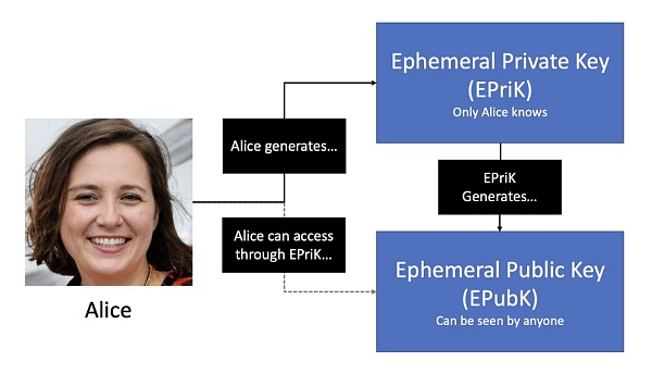 臨時公鑰是臨時私鑰生成的,就類似于助記詞生成以太坊地址。臨時公鑰可以發到任何人都可以查看的公共分類賬。臨時密鑰對只使用一次,因此Alice如果想與其他人進行交易,則必須生成新的臨時密鑰對。