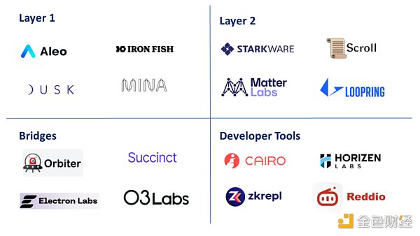 下圖中的項目和公司正在構建整個區塊鏈技術堆棧的技術設施,從第 1 層區塊鏈到第 2 層 rollup、跨鏈橋、互操作性層、新的語言和針對 zk 應用程序優化的環境等。