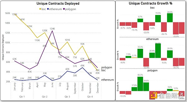 就部署的唯一合約數量而言,BNB Chain 下降趨勢最強。12 個月中有 9 個月出現收縮,年初至今為 -70%。Polygon 于 2022 年 12 月翻轉了 BNB Chain。