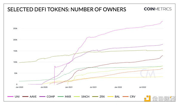 查看 DeFi 代幣的所有者數量也有助于評估采用率和興趣。在 DAO 的背景下,去中心化的所有者基礎可能是有利的,因為它意味著更廣泛的選民基礎,對問題的看法也是呈現多樣化的。大多數代幣在 2022 年的鏈上所有者數量呈緩慢上升趨勢,然后在 11 月顯著上升,因為許多用戶將他們的代幣轉出了交易所。