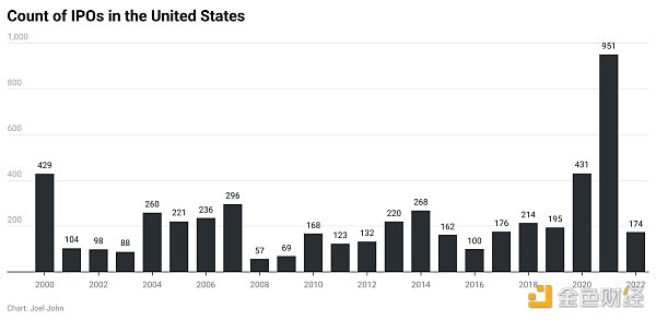 俗話說,「錢生錢」。換句話說,就是流動性產生流動性。當公開市場參與者看不到回報時,私人市場參與者就會坐以待斃。因為幾乎不存在冒險和向早期玩家部署資金的胃口。首次公開募股的數量與早期風險交易中部署的資本數量直接相關。風投一旦看到上市公司的回報,就會將資金轉回新的初創公司。上圖顯示了過去幾年風險投資活動快速增長的原因。IPO 數量的增加可能是其中的一個原因。