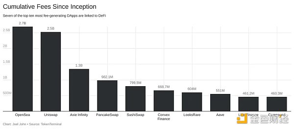 我整理了一份費用排名前十的去中心化應用,供大家參考。前 10 名中大約有 7 個以某種形式屬于 DeFi。選擇偏差?好吧。如果參考 TokenTerminal 上的前 25 名,你會發現有約 22 個與 DeFi 相關。這里有一個論點是,與 NFT 相比,DeFi 產生更多的收入,因為它具有先發優勢(2018 年左右),NFT 僅在 2020 年左右才開始騰飛。