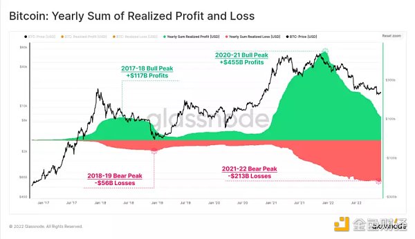 2020-2021年寬松的貨幣政策時代的過剩流動性泡沫創造了創紀錄的年度鏈上總利潤。BTC投資者在鏈上遷移的年度利潤超過4550億美元,在2021年11月BTC創下新高之后不久,該數值達到了高峰。