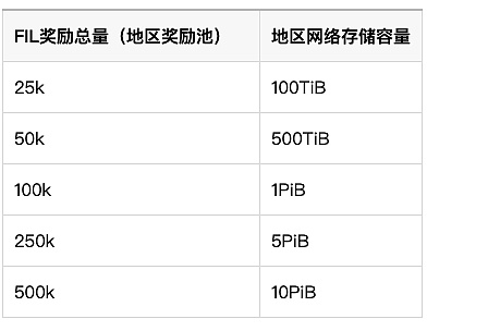 這個礦工將從區域排行榜(總共25萬個FIL獎勵 * 1.5PiB / 3.0PiB)中獲得125,000個FIL并且從全球排行榜(總共1百萬個FIL獎勵 * 1.5PiB / 100PiB)中獲得 15,000個FIL,總計 140,000個FIL 。