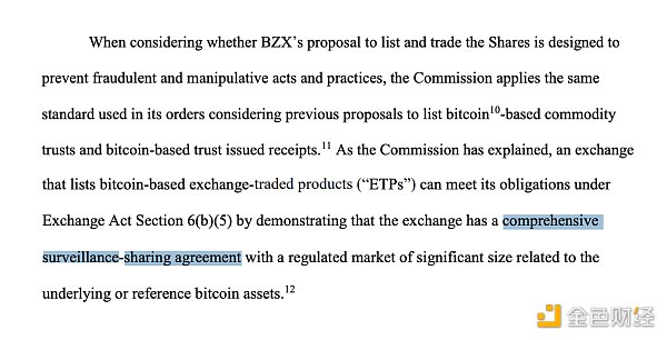 為了證明上市擬議的比特幣 ETF 現貨的交易所能夠履行《交易法》規定的義務,美國證券交易委員會規定了“與基礎或參考比特幣資產相關的規模較大的受監管市場的全面監督共享協議”。