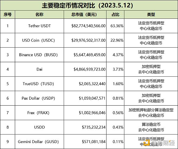 從上圖可以看出,在穩定幣市場中,市值占比前九位的穩定幣就占有 97% 以上的份額。排名前五的穩定幣占比超過 96%,分別為 Tether USDT、USD Coin USDC、Binance USD BUSD、DAI 和 TrueUSD TUSD。上述三種穩定幣占據了整個穩定幣市場的 90%以上,從穩定幣的類型上來看,USDT、USDC、BUSD 都屬于中心化的穩定幣,均以現實的資產抵押進行發行;除此之外,還有去中心化穩定幣,比如我們熟知的由 MarkerDAO 發行的 DAI市值為 48.6 億美元,占比僅有 3.73%。