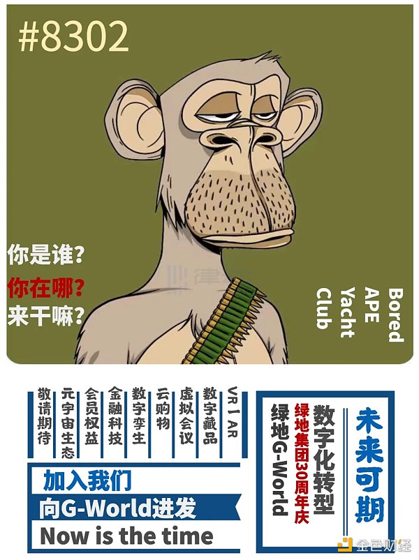 根據鏈上的數據顯示,綠地集團以 140ETH(當時的價值約為 40 萬美元)購買了編號為 #8302 的 BAYC「無聊猿」NFT。綠地集團購買的「無聊猿」BAYC 編號 8302 有著特別的寓意:其中"8"的發音與「把」相近,"30"代表綠地集團成立 30 周年的紀念,而"2"則象征著這是綠地集團二次創業的新起點。