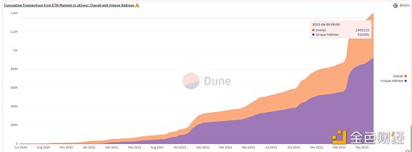 zkSync Era網絡用戶地址數量突破100萬個:6月27日消息,據 Dune Analytics 數據顯示,zkSync Era 網絡用戶地址(指將資金轉移至 zkSync Era 網絡地址)數量已突破 100 萬個。