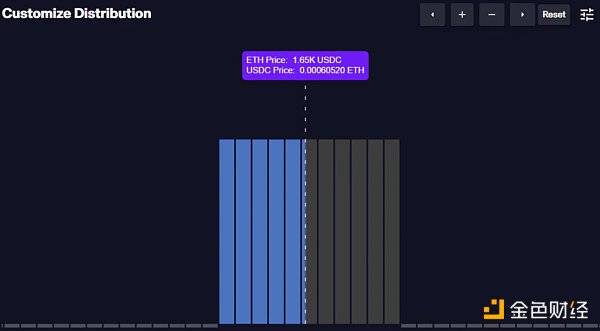 通過上圖可以看到,如果價格只在 1800-2200 之間徘徊,萬一這里出現了極端行情,由于所有價格區間的池子都一樣厚,價格很有可能被砸得很低,而閑置資金卻站在一旁觀望,沒有起到任何作用。