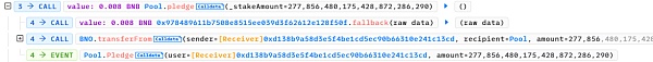 (3)接著調用被攻擊合約(0xdCA50344)的pledge函數質押277856枚BNO幣。
