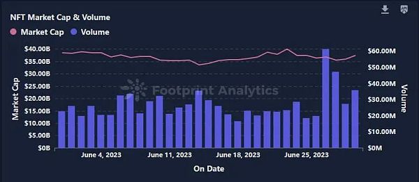 從交易量上來看,NFT 市場在 6 月份經歷了一些波動。月初,交易量為 2,620 萬,到 6 月 18 日下降至最低點 1,659 萬,月底交易量反彈至 3,586 萬。6 月 27 日交易量達到 6,145萬,這在很大程度上歸因于 Azuki,單個系列交易量就達到了 2,000 萬。