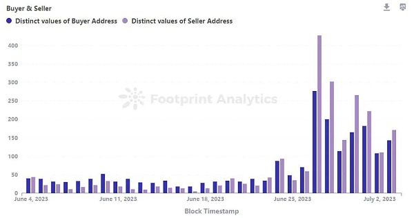 6 月 28 日,Azuki Elementals 的發布導致交易量大幅增加。然而,由于圖片質量問題,不久就出現了大量的拋售,這也影響了對 Azuki 系列的社區情緒。那一天,Azuki 系列的賣家數量是買家數量的兩倍。這種大規模拋售代表了市場對 Azuki Elementals 事件的反應。