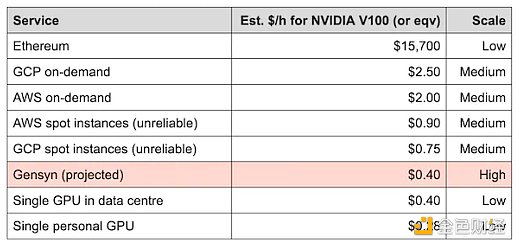 大規模+低成本:Gensyn 協議提供了與數據中心擁有的GPU相似的成本,其規模可以超過AWS