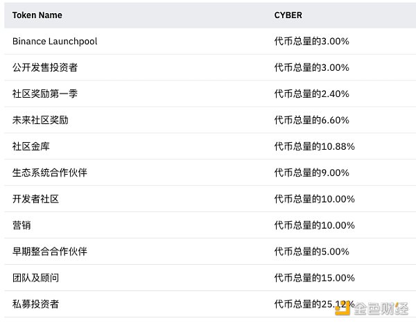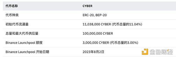 截至2023年8月1日,CYBER的總供應量為100,000,000,上市后的流通供應量為11,038,000(約占代幣總供應量的11.04%)。