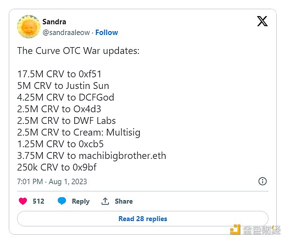 Leow 表示,Egorov 在場外以低于市場價格每枚 0.40 美元的價格向幾位買家出售了約 5000 萬枚 CRV 代幣。 此次出售包括三到六個月的歸屬協議,或者也可以出售,價格應達到 0.80 美元。