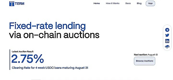 我最近偶然發現了一個有趣的協議。Term Finance 可以讓你在設定的時間內以固定利率借錢。(例如,4 周為 4%)。利率是通過拍賣決定的。借款人設定一個出價,貸款人設定一個出價。經過這種在出價上“討價還價”后的數字將成為最終的利率。每周四開始/結束一次拍賣。