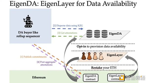 Eig enDA 是 EigenLayer 團隊開發的數據可用性層。數據可用性層是一種僅關注 數據存儲和驗證的層,對于網絡的安全性和可擴展性也至關重要。其他數據可用 性層包括 Celestia 和 Polygon Avail,它們通過自己的代幣質押機制來維護 安全性。然而,Eig enDA 具有通過市場上已經非常有價值的 ETH 代幣維護安全