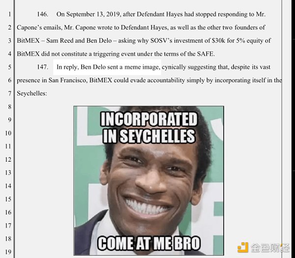 但其實,原告也拿 BitMEX 沒什么辦法,畢竟 BitMEX 是特意注冊在塞舌爾來規避美國監管的。BMA 只能從客戶的郵件信息,來間接證明 BitMEX 在美國有運營業務,這點微不足道的證據后來還被BitMEX 的人拿來調侃:老子在塞舌爾注冊的,過來干我啊!他們仍舊很狂。