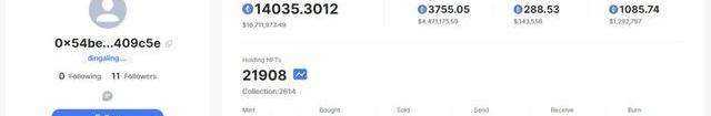 以下是通過持倉價值排名前三位,錢包地址為:0x54be3a794282c030b15e43ae2bb182e14c409c5e進行錢包數據分析。根據NFTScan數據,目前該地址持倉價值高達14035.3個ETH,買入3755ETH,售出288ETH,Gas消耗1085.7ETH,持有NFT超兩萬個,其中包括交易的細節方式,如Mint/Bought/Sold/send/Receive/Burn。鏈接錢包地址還可以對該巨鯨地址進行Follow,實時查看該地址的動態。