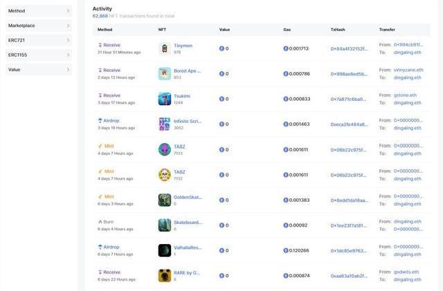 Acitivity界面提供該巨鯨按照時間就近排序的實時交易活動,這里可以看到該錢包地址存在共發現62,868筆NFT交易記錄,在這里,你實時監測該巨鯨正在進行和曾經進行的全部交易記錄。同時,在左側提供了查找數據的篩選條件,默認是按時間順序進行的全部方式。篩選條件主要包括