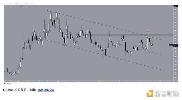 然而,LDO在通道的阻力線和7月14日的$2.40阻力區域遭到拒絕。此后價格有所下跌,但仍在通道的上部交易。