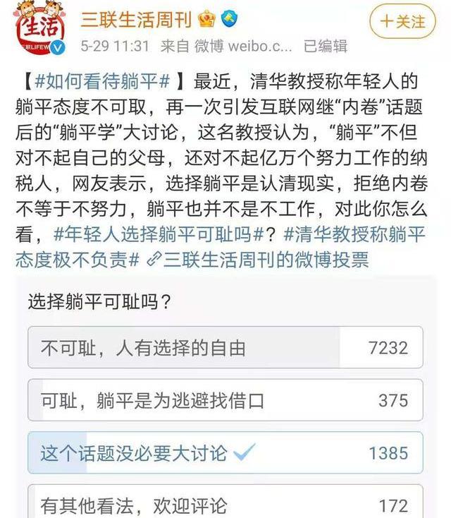 其實躺平并不是不工作,也不是不納稅。而是現在年輕人對于窮者越窮,富者越富的一種自我安慰般的抗議。現在的年輕人剛出大學,看著高額的房價,思考著要打工多少個年頭才能屬于自己,還要接受著一碗接一碗的莫名雞湯水。我猶記得五四青年節當天,企鵝的公關負責人張軍發了一條微博“當我們忙著做各種致敬青年的策劃時,青年們正在睡覺。”引發了青年們的怒氣并發泄在張軍微博下,一舉讓張軍這句話成為了熱門話題,至于有沒有破防我就不得而知了。從這已經可以看出青年們對當下的這種氛圍已經產生了不喜,當一個事物已經強大到了你無法對抗了,我想很多人都會選擇逃避吧。于是就有了最近新出的這個學派“躺平學”。然后就是清華教授對青年選擇躺平的批判。